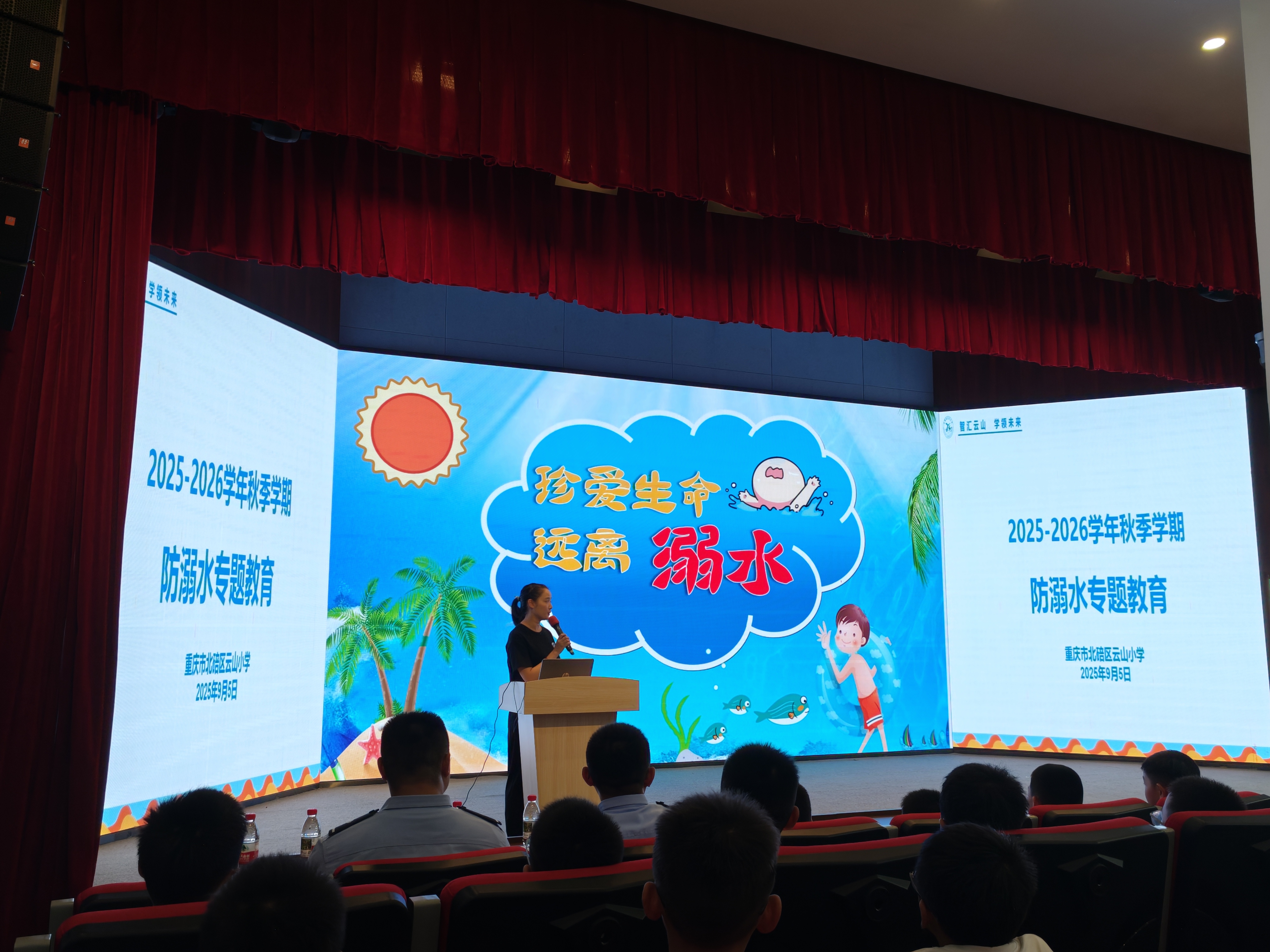 9月5日,北碚区云山小学迎来了一场别开生面的“开学安全第一课”。北碚区交通运输委“碚小航”青年志愿服务突击队联合水警总队北碚派出所,以“交+警+校”三方联动防溺水机制为平台,“内外协同”为两百余名高年级学生敲响新学期的安全“第一钟”。