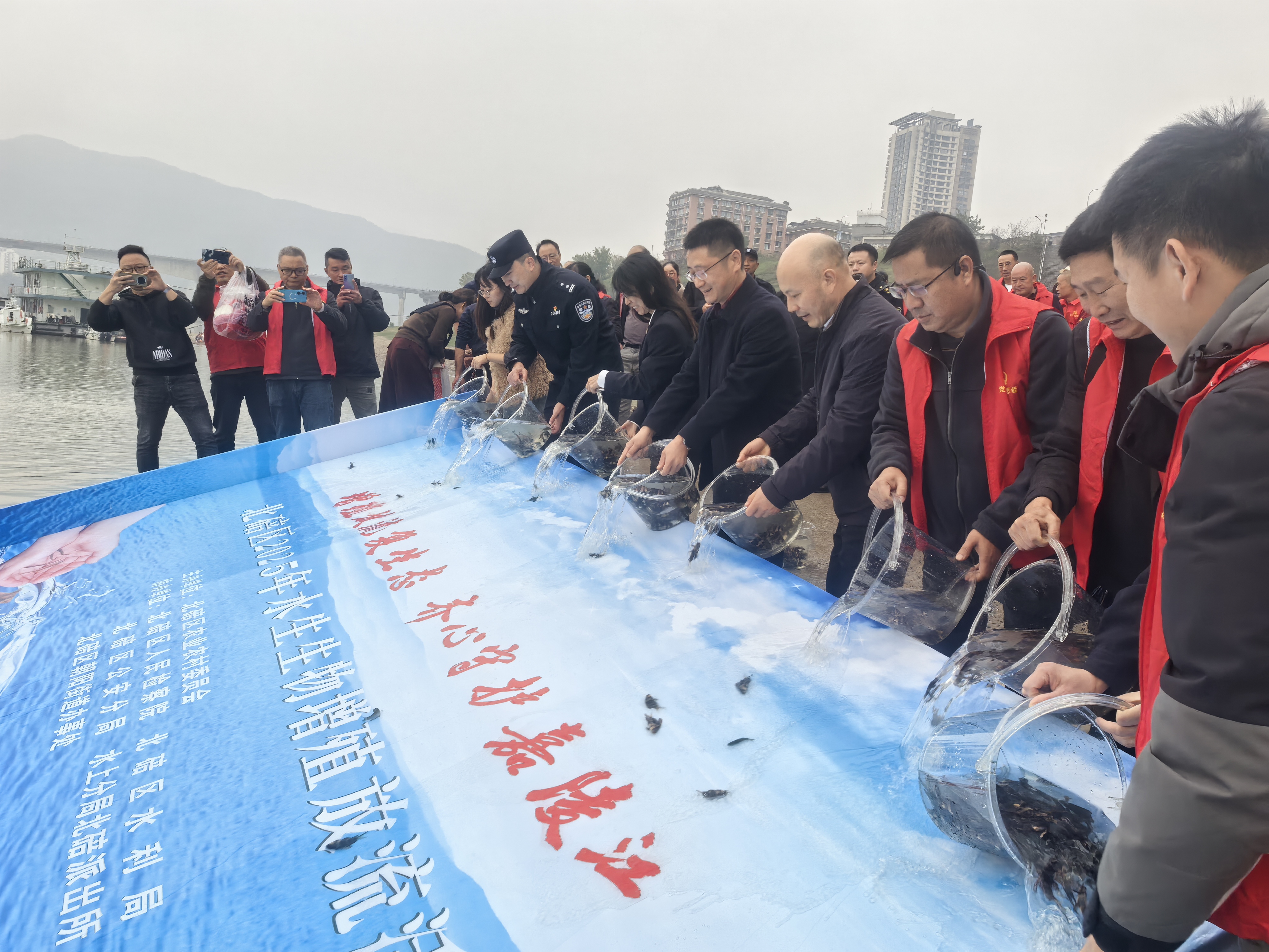 11月14日下午,北碚区在嘉陵江正码头增殖放流平台开展以“增殖放流复生态 齐心守护嘉陵江”为主题的2025年水生生物增殖放流活动,本次共计放流胭脂鱼、岩原鲤、中华倒刺鲃、厚颌鲂、长吻鮠等各类鱼苗共计48万尾,区农业农村委、区检察院、区水利局、区公安分局、水上分局北碚派出所、朝阳街道办事处等单位共计30余人参加。活动还邀请了西南大学渔业专家张春霖副教授为大家科普渔业资源保护相关知识,并介绍增殖放流的相关注意事项。