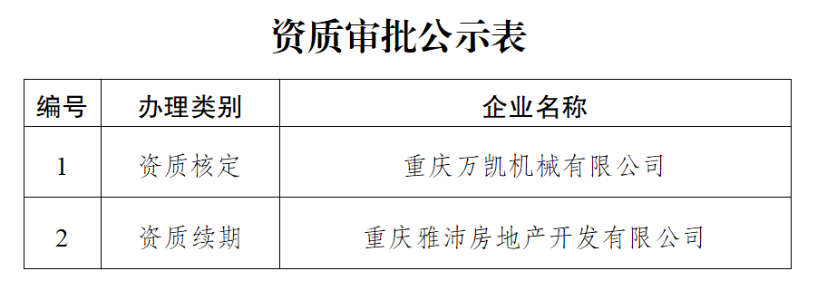 为规范我区房地产开发企业资质审批工作,保证资质审批公正性,增加审批工作透明度,现将重庆万凯机械有限公司房地产开发企业二级资质核定、重庆雅沛房地产开发有限公司房地产开发企业二级资质续期审批情况进行公示,以广泛接受社会监督。公示时间为:2025年12月17日至2025年12月25日,如企业对结果有异议,需在2025年12月26日前以书面形式提供陈述材料,并加盖本单位印章后报送我委,逾期不予受理(邮寄的陈述材料以邮戳日期为准)。任何有关单位及个人,如对企业申报资质情况有不同意见需要反映的,请在公示期内以书面形式将反映的情况寄(送)到北碚区政务服务中心4楼412号窗口,单位反映情况要加盖公章,个人反映情况要签署真实姓名,并需留下真实的联系电话、地址、邮编。