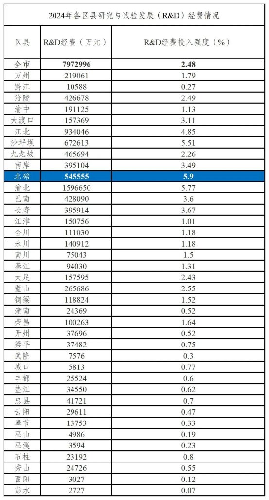 10月9日,重庆市统计局、重庆市科技局联合发布了《2024年重庆市科技经费投入统计公报》,公报显示,北碚区研究与试验发展(R&D)经费投入强度为5.90%,在38个区县中排名第一,比上年提高1.44个百分点,超出全市平均水平3.42个百分点;研究与试验发展(R&D)经费达54.56亿元,较上年增加19.6亿元,同比增长56%,研究与试验发展经费总量和投入强度双双创历史新高。