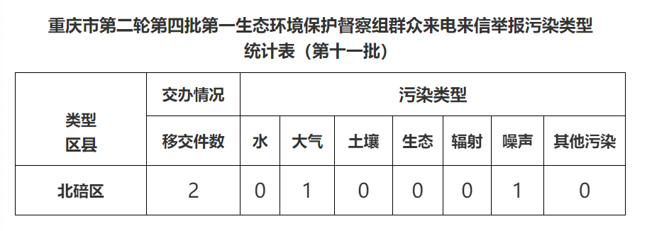 12月12日,重庆市第一生态环境保护督察组向北碚区交办第十一批群众信访举报件2件。从信访举报件涉及的生态环境问题类型来看,涉及大气1件、噪声1件。