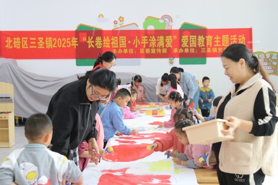 近日,三圣镇联合辖区幼儿园精心组织“长卷绘祖国,小手涂满爱”主题活动。32名小朋友以10米长卷为创意载体,用五彩画笔描绘爱国符号,在沉浸式创作中完成了一堂生动的爱国启蒙课。
