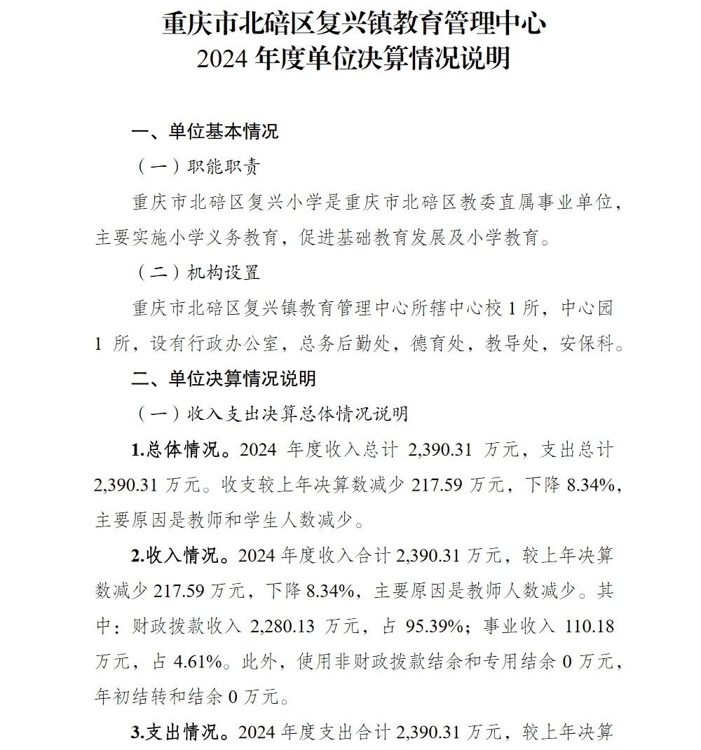 重庆市北碚区复兴镇教育管理中心2024年度单位决算情况说明
