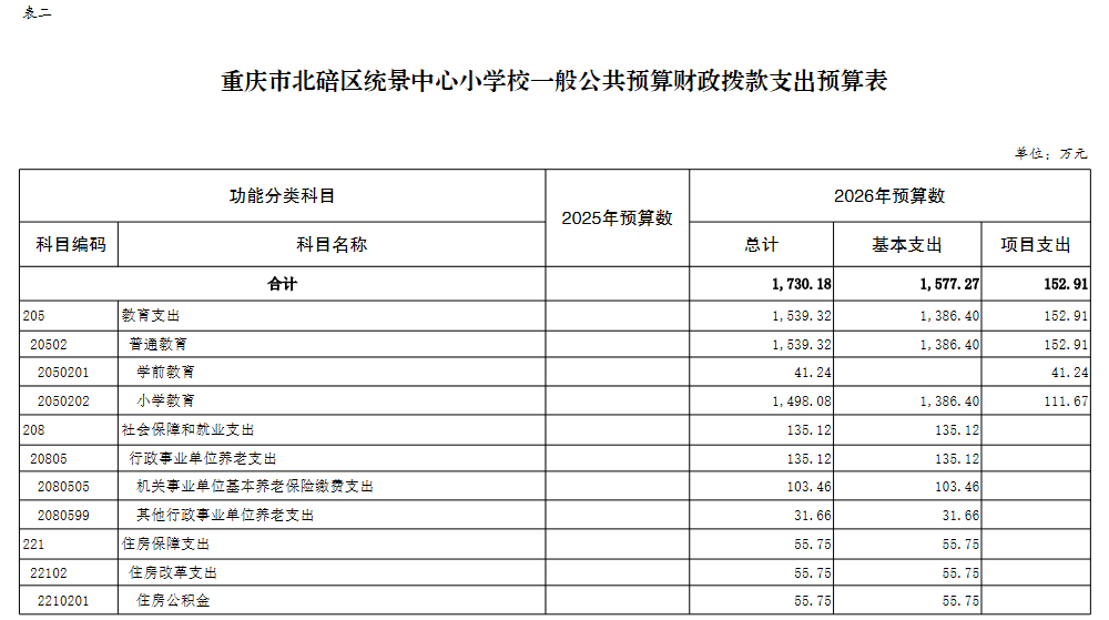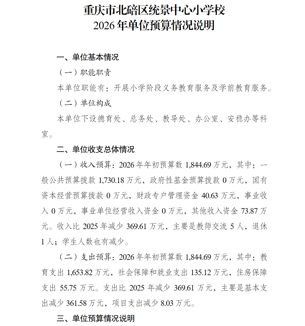 重庆市北碚区统景中心小学校2026年单位预算情况说明