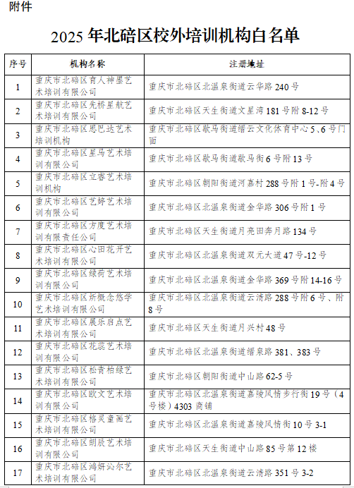 注销非学科类培训机构名单:重庆市北碚区飞达艺术培训机构、重庆市北碚区田甜艺术培训有限公司、重庆市北碚区贝贝熊艺术培训有限公司、重庆市北碚区乐亦吾思艺术培训有限公司、重庆市北碚区慧晨艺术培训有限责任公司、重庆市北碚区傲尘墨雅艺术培训有限公司