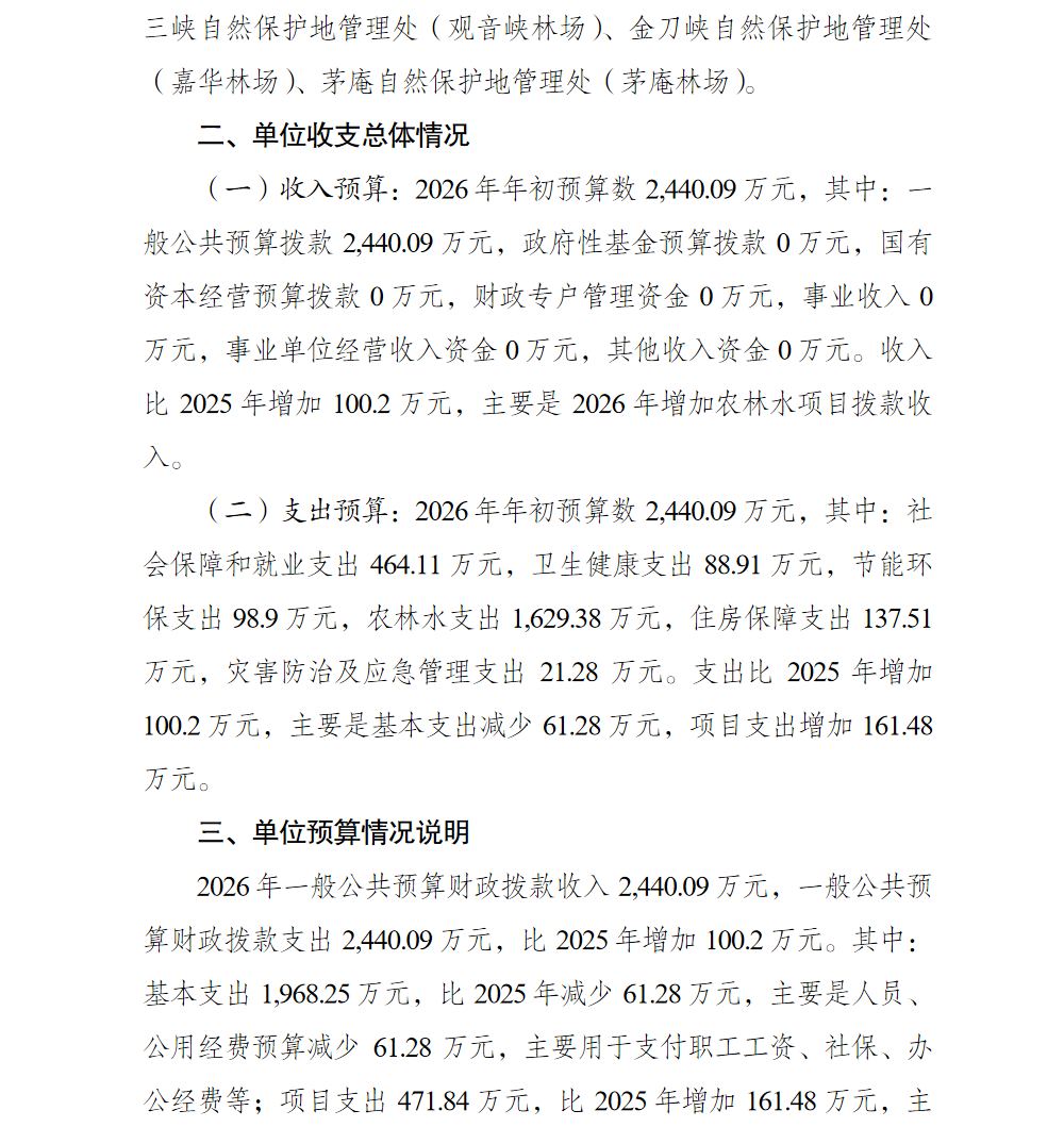 重庆市北碚区自然保护地管理中心2026年单位预算情况说明