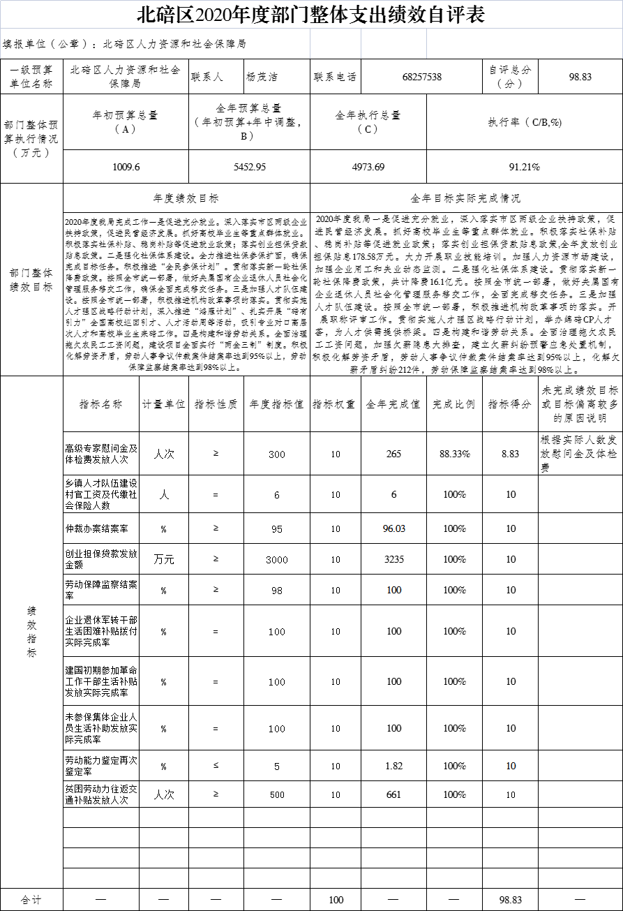 根据预算绩效管理要求,本部门对25个项目开展了绩效自评,其中,以填报目标自评表形式开展自评25项,涉及资金2092.29万元。未委托第三方形式开展绩效自评。从评价情况来看,我局严格按照相关文件规定,严格执行工作流程,依规使用各项费用。切实保障了用人单位和个人的合法权益。