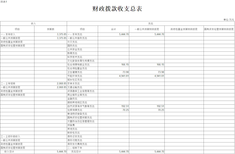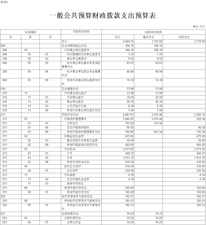 2020年一般公共预算财政拨款收入5,444.7万元,一般公共预算财政拨款支出5,444.7万元,比2019年增加323.48万元。其中:基本支出1725.85万元,比2019年增加115.52万元,主要原因是增人增资以及物价上涨导致商品及服务支出增加等,主要用于保障在职人员工资福利及社会保险缴费,保障部门正常运转的各项商品服务支出;项目支出3,718.85万元,比2019年增加207.96万元,主要原因是为给辖区内人民群众营造良好的生态环境,本年度加大投入水污染防治、蓝天行动、监测能力建设以及生态保护等项目。