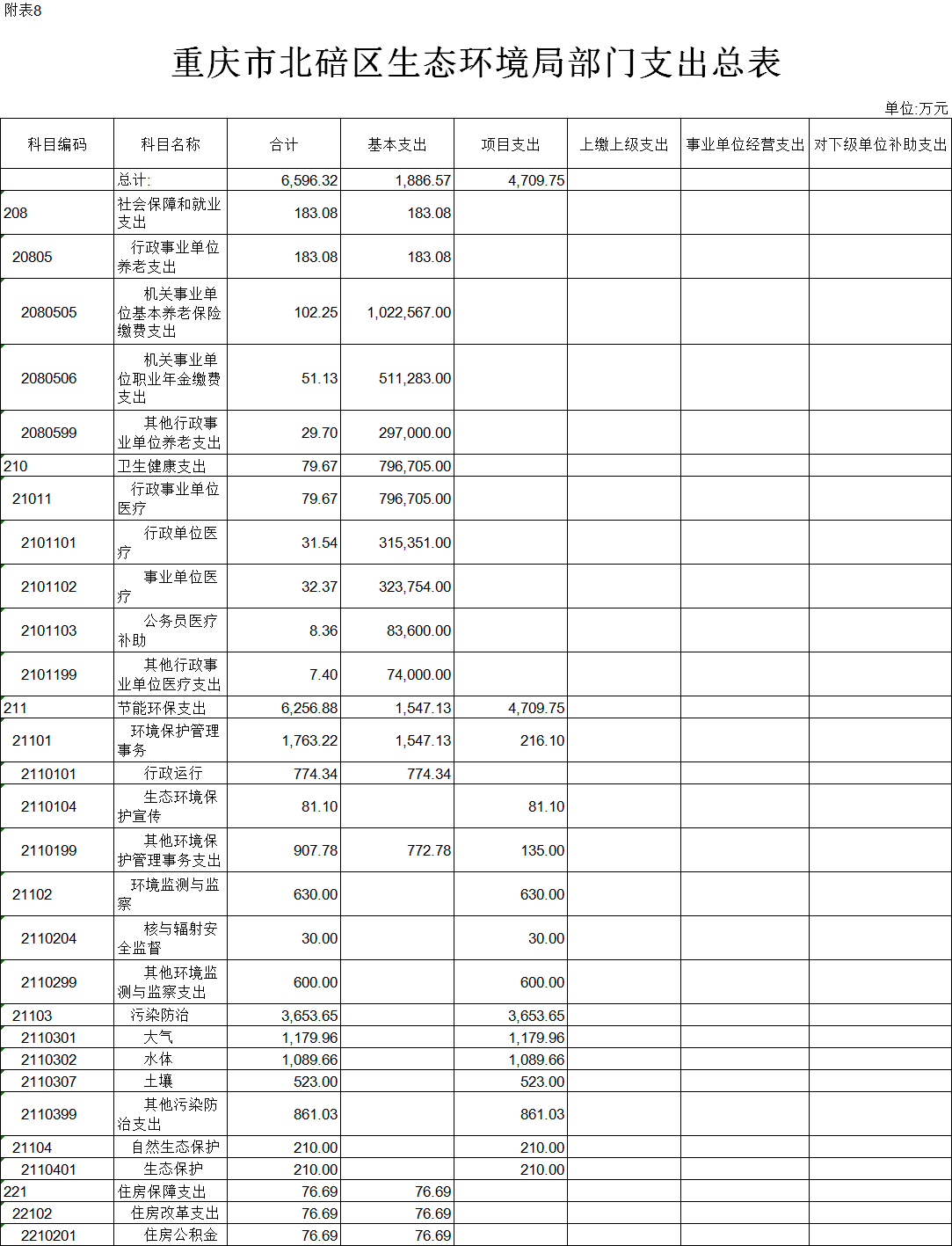 (二)支出预算:2021年年初预算数6596.32万元,其中:社会保障和就业支出183.08万元,卫生健康支出79.67万元,节能环保支出6256.88万元,住房保障支出76.69万元。支出预算较2020年增加1151.62万元,主要是基本支出预算增加160.72万元,项目支出预算增加990.9万元。