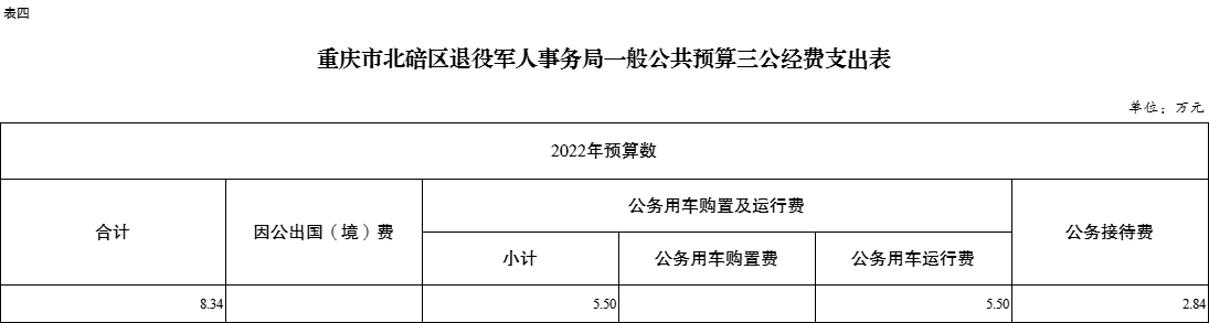 2022年“三公”经费预算8.34万元,与2021年无变化。其中:因公出国(境)费用0万元,与2021年无变化;公务接待费2.84万元,与2021年无变化;公务用车运行维护费5.5万元,与2021年无变化;公务用车购置费0万元,与2021年无变化。