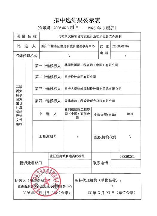马鞍溪大桥项目方案设计及初步设计文件编制第二次竞争性比选拟中选结果公示表