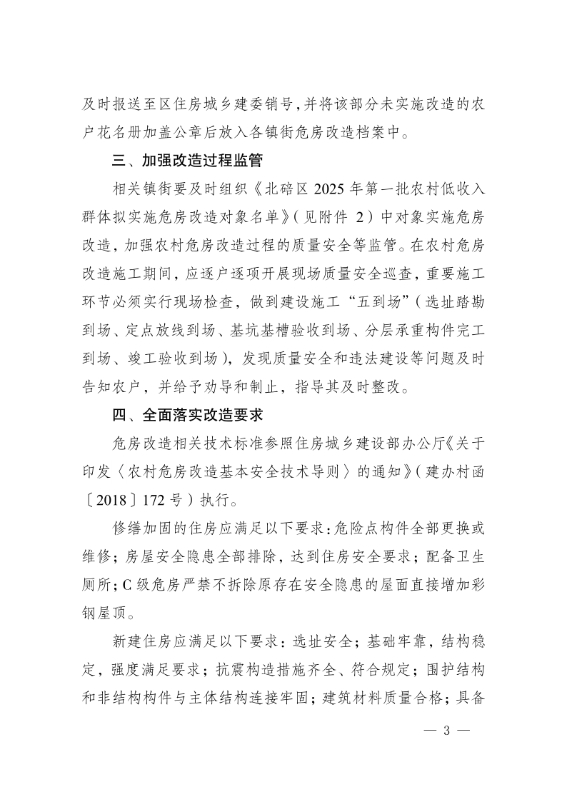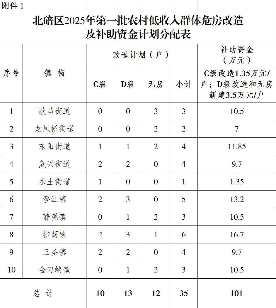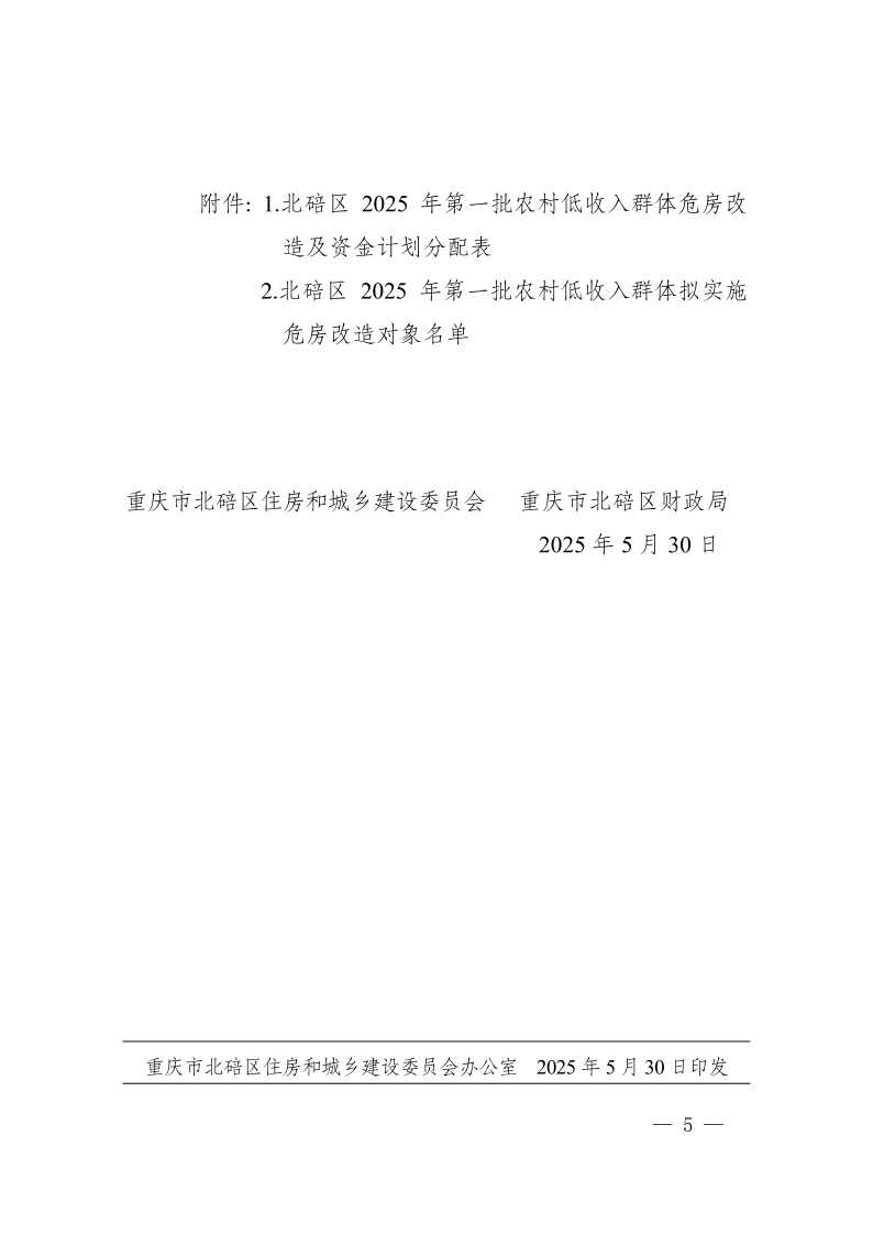 重庆市北碚区住房和城乡建设委员会重庆市北碚区财政局关于下达2025年第一批农村低收入群体危房改造及资金计划的通知