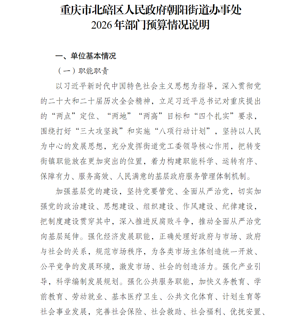 重庆市北碚区人民政府朝阳街道办事处2026年部门预算情况说明