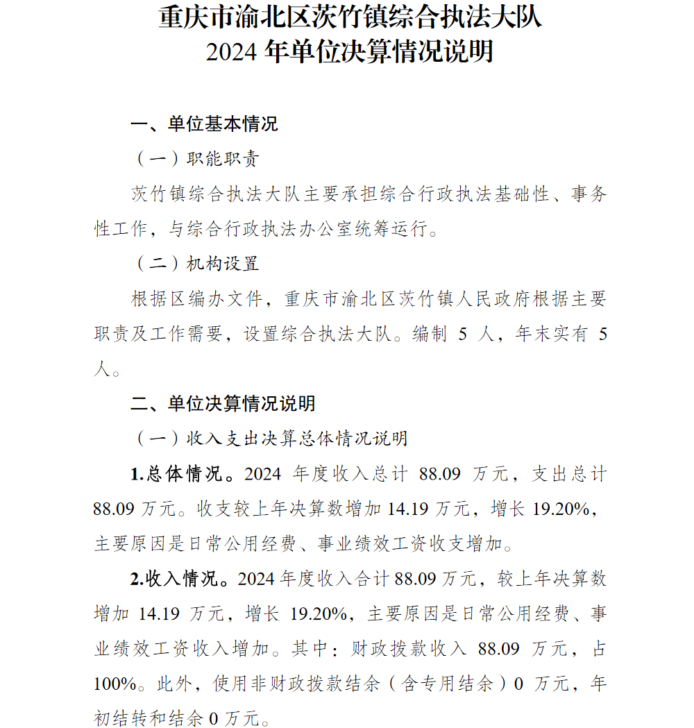 重庆市渝北区茨竹镇综合行政执法大队2024年部门决算公开