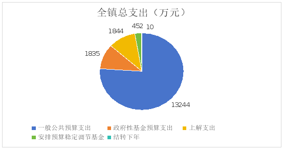 全镇总支出17385万元,其中:一般公共预算支出13244万元、政府性基金预算支出1835万元、上解支出1844万元、安排预算稳定调节基金452万元、结转下年10万元。