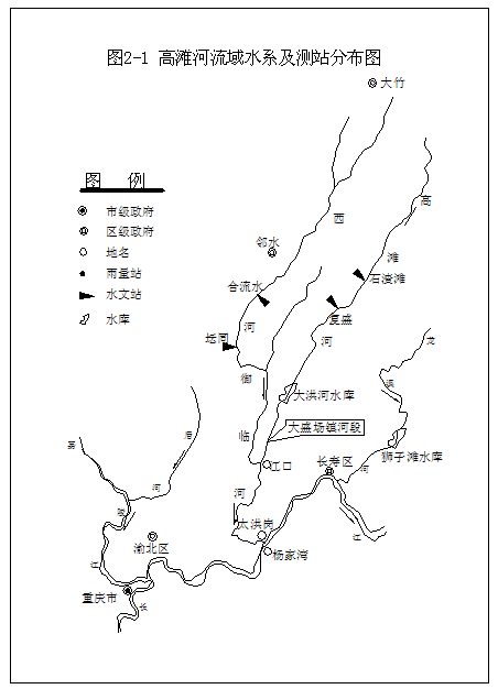 东河上游有大洪河水电站,位于重庆市长寿区境内,坝址以上河流长89km,集雨面积为1317km2,水库总库容3.47亿m3,电站总装机容量35MW。大洪河水电站下游至大盛场镇间河道上还建有2座小水电站:水碾电站和长明电站,其中水碾电站装机容量为3×800kw,长明电站装机容量为3×1200kw。大盛场镇河段下游1km为过马滩水库大坝,位于大洪河水库坝址下游22.9km处,属重庆市渝北区大盛镇,过马滩水库坝址以上河流长112km,流域面积为1432km2;大洪河水电站坝址与过马滩水库大坝的区间集集雨面积为115km2。