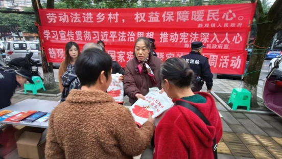 12月4日,是第十二个国家宪法日。静观镇平安法治办携手静观司法所和静观镇人大,在静观街上开展了一场以“学习宣传贯彻习近平法治思想,推动宪法深入人心”为主题集中宣传活动,并以此为契机在全镇组织开展12月1日至7日的2025年“宪法宣传周”活动。