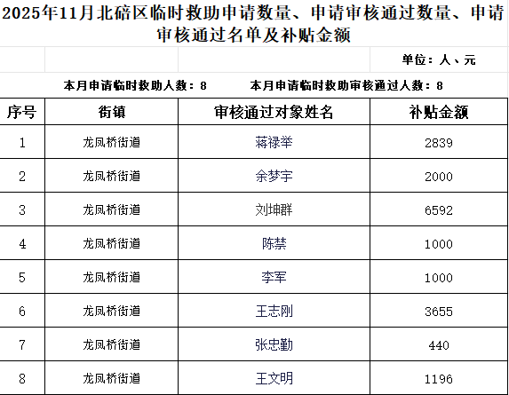 2025年11月北碚区临时救助申请数量、申请审核通过数量、申请审核通过名单及补贴金额