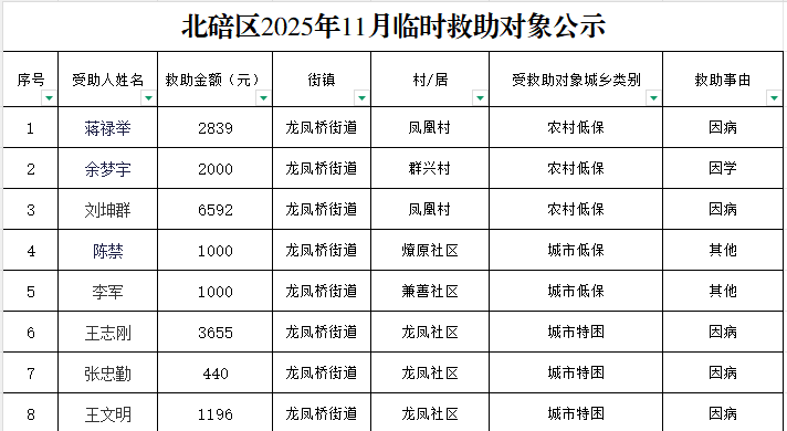 北碚区2025年11月临时救助对象公示