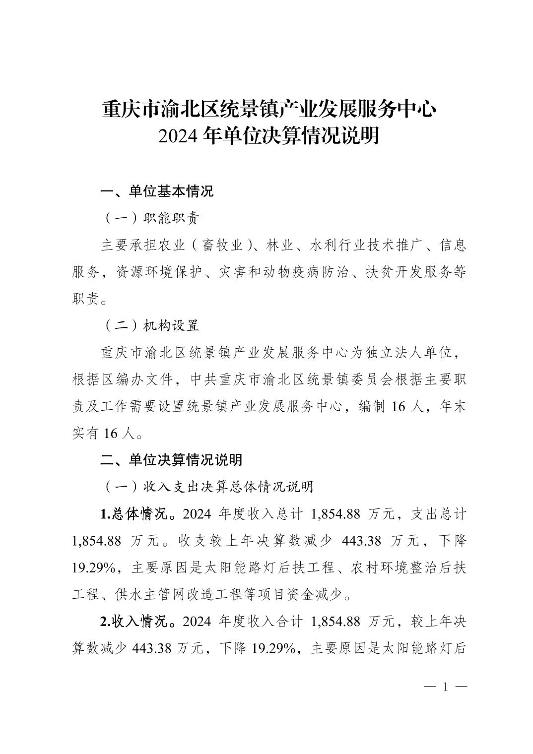 重庆市渝北区统景镇产业发展服务中心2024年单位决算情况说明