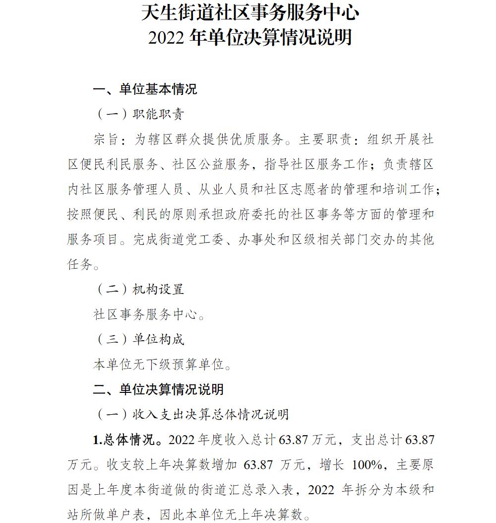 重庆市北碚区天生街道社区事务服务中心2022年度单位决算情况说明