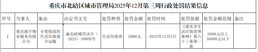 重庆市北碚区城市管理局2025年12月第三周行政处罚结果信息