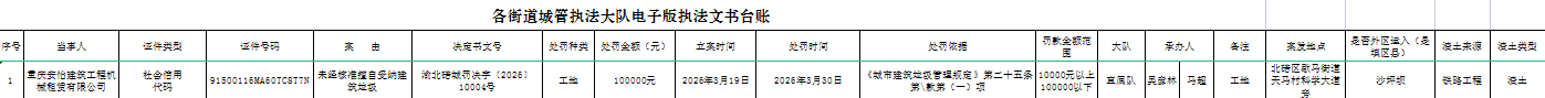 重庆市北碚区城市管理局2026年3月第5周行政处罚结果信息