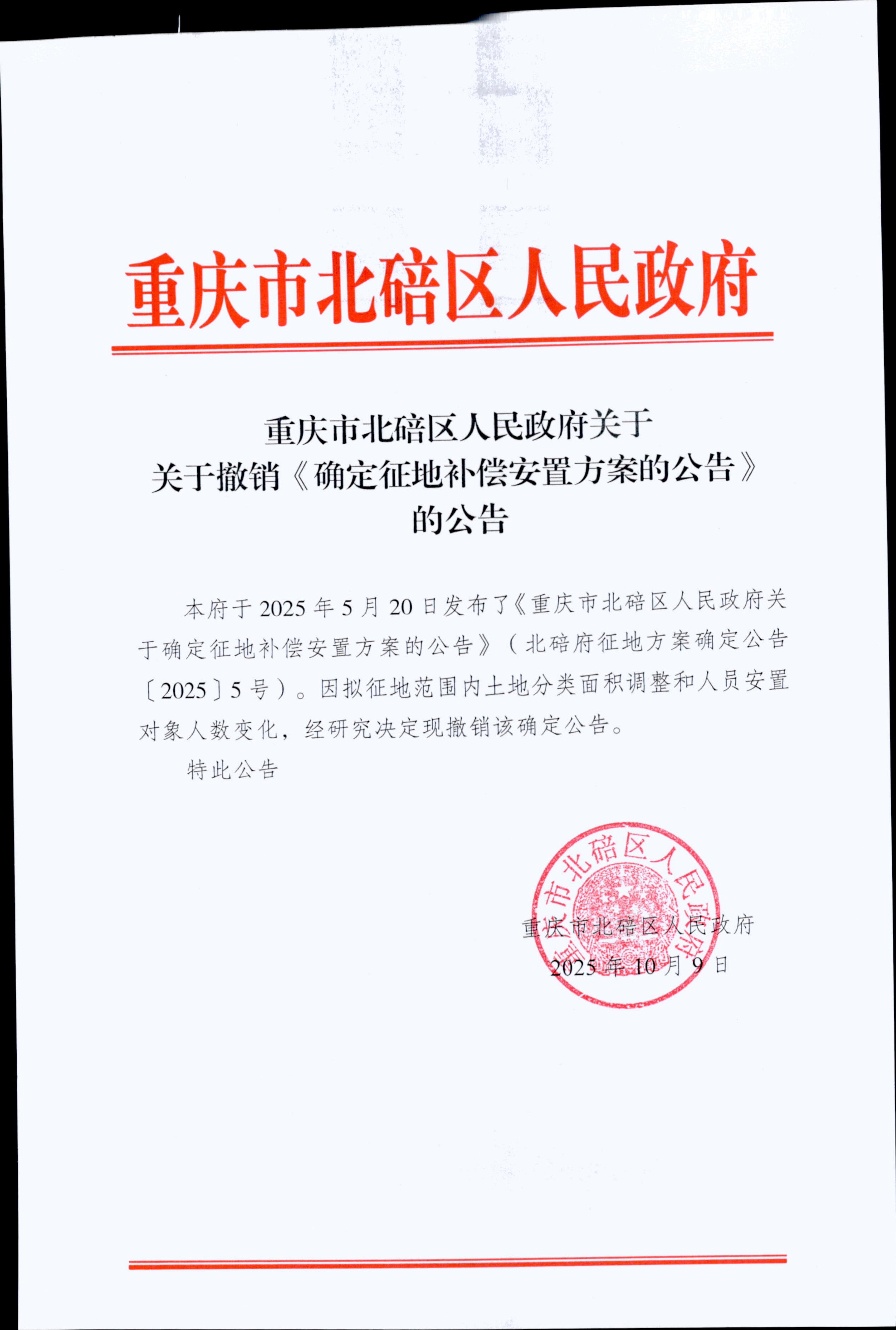 重庆市北碚区人民政府关于撤销《确定征地补偿安置方案的公告》