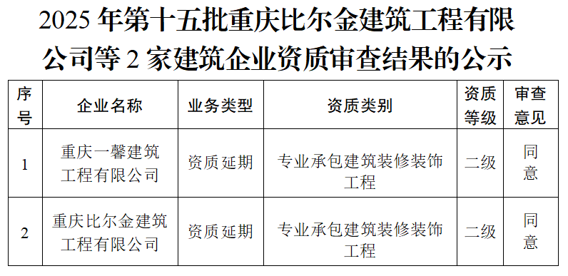 按照《中华人民共和国行政许可法》《建筑业企业资质管理规定》(住建部令第22号)《建筑业企业资质等级标准》(建市〔2014〕159号)和《建筑业企业资质管理规定和资质标准实施意见》(建市〔2015〕20号)的规定,经企业申报,我委近期对2025年第十五批重庆比尔金建筑工程有限公司等2家建筑业企业资质延期的申请材料进行了审查,现将审查意见予以公示。公示截止日期为2025年11月13日。(审查意见为不同意的企业,自公示之日起2天后可通过“重庆建设工程信息网→网上申报→行政审批服务中心信息管理平台”查询具体意见。)