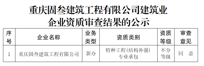 按照《中华人民共和国行政许可法》《建筑业企业资质管理规定》(住建部令第22号)《建筑业企业资质等级标准》(建市〔2014〕159号)和《建筑业企业资质管理规定和资质标准实施意见》(建市〔2015〕20号)的规定,经企业申报,我委近期对重庆固叁建筑工程有限公司企业申请建筑业企业资质的申请材料进行了审查,现将审查意见予以公示。公示截止日期为2025年11月21日。