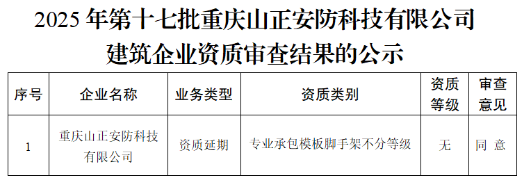 按照《中华人民共和国行政许可法》《建筑业企业资质管理规定》(住建部令第22号)《建筑业企业资质等级标准》(建市〔2014〕159号)和《建筑业企业资质管理规定和资质标准实施意见》(建市〔2015〕20号)的规定,经企业申报,我委近期对2025年第十七批重庆山正安防科技有限公司建筑业企业资质延期的申请材料进行了审查,现将审查意见予以公示。公示截止日期为2025年12月13日。(审查意见为不同意的企业,自公示之日起2天后可通过“重庆建设工程信息网→网上申报→行政审批服务中心信息管理平台”查询具体意见。)