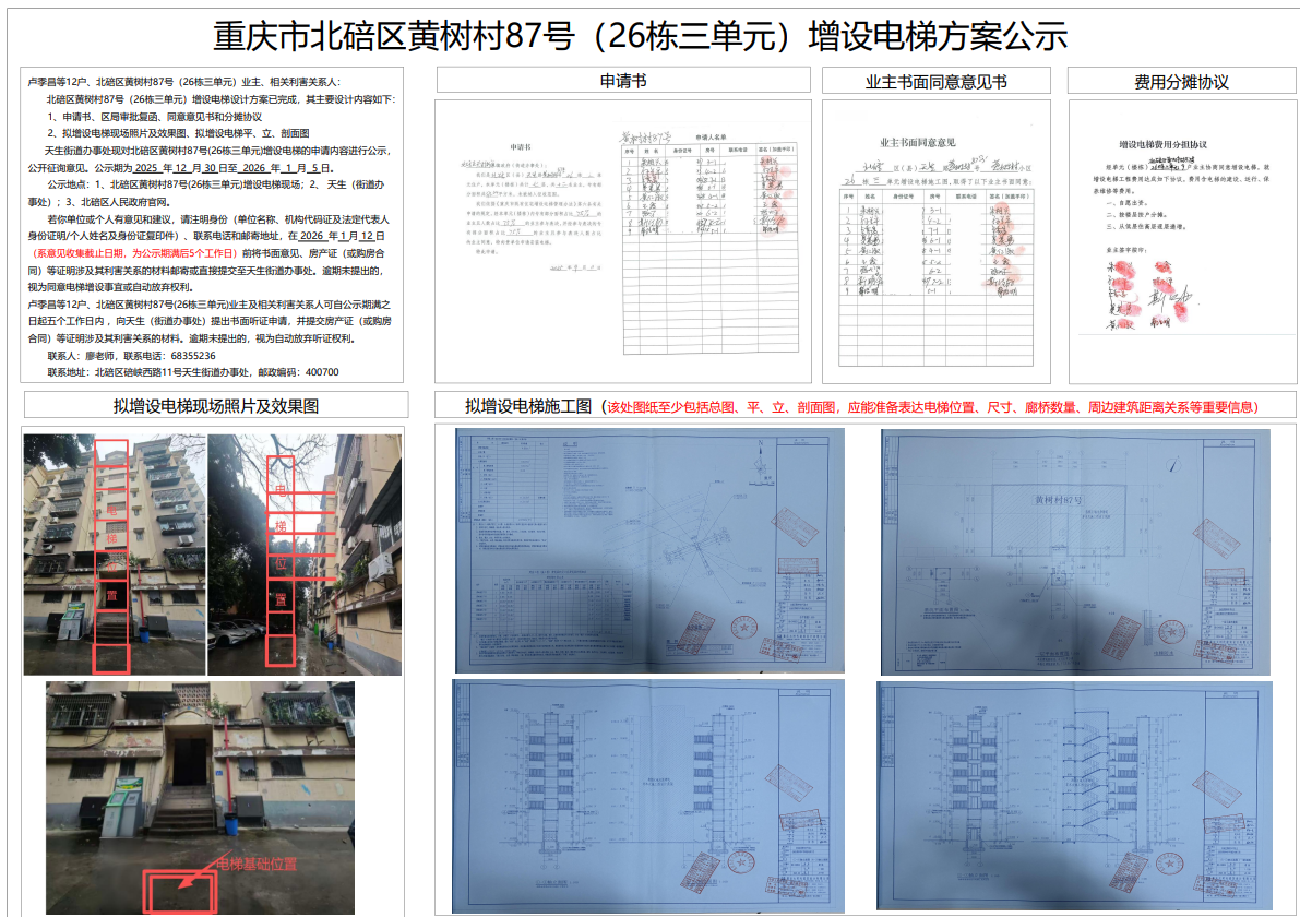 重庆市北碚区黄树村87号(26栋三单元)增设电梯方案公示