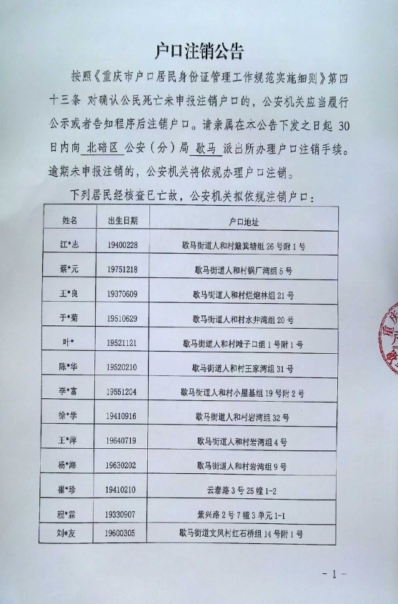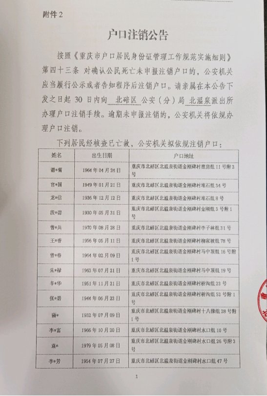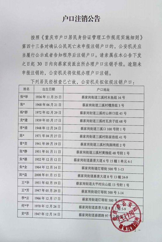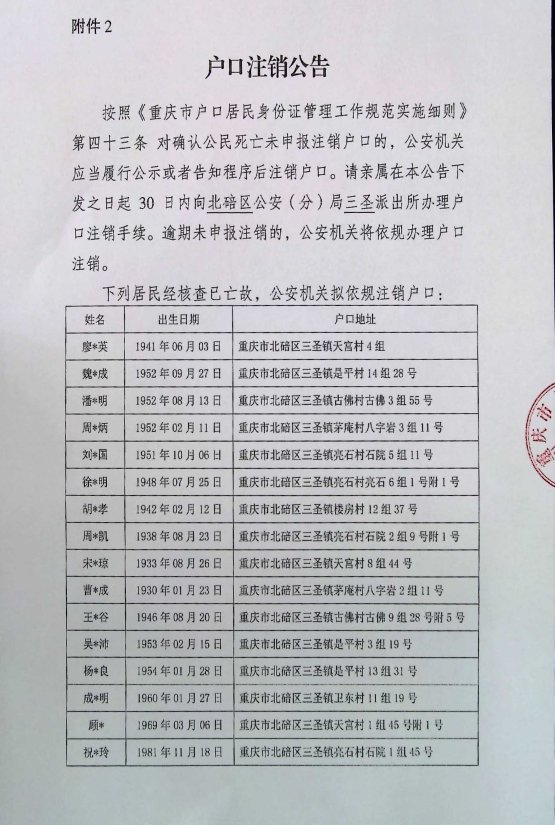 按照《重庆市户口居民身份证管理工作规范实施细则》第四十三条 对确认公民死亡未申报注销户口的,公安机关应当履行公示或者告知程序后注销户口。经核实,以下居民已亡故,公安机关拟依规注销户口,现予以公告: