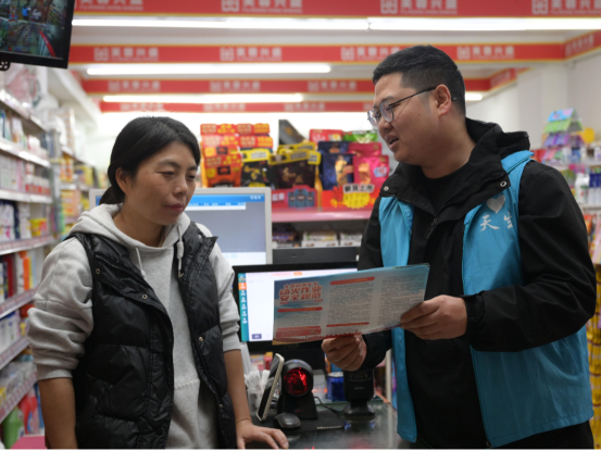 奔月路社区开展消防安全宣传活动,对辖区沿街门店进行“全覆盖、无死角”走访。工作人员向门店负责人普及消防安全知识,强化经营户安全意识与应急能力,助力构建安全稳定的社区环境,防范火灾安全事故发生。