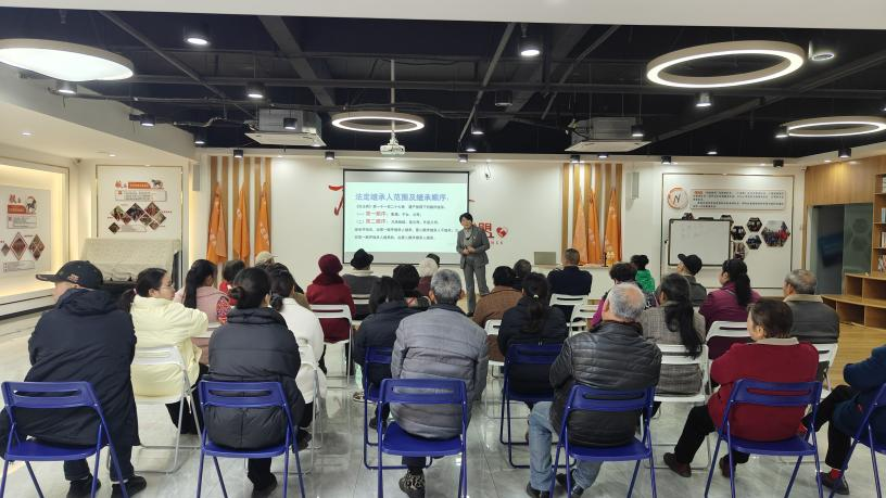本次活动特邀专业律师进行授课,聚焦居民关切的继承法律问题,通过典型案例解析、互动问答等形式,系统解读法定继承顺序、遗嘱形式要件、遗产范围界定等法律要点,并针对“独生子女必然全额继承”“口头遗嘱当然有效”等常见误区进行讲解。