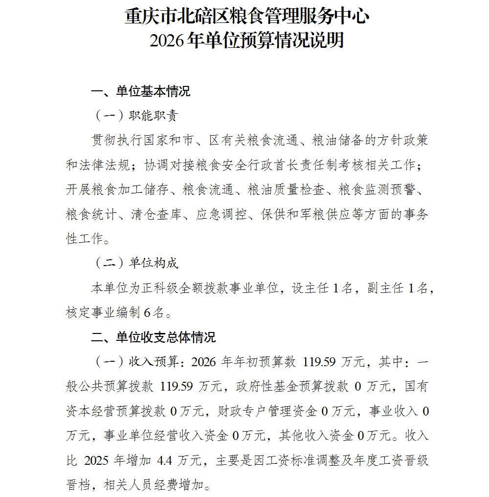 重庆市北碚区粮食管理服务中心2026年单位预算情况说明