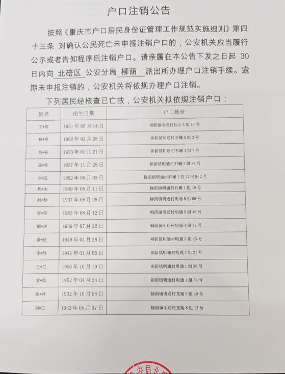 按照《重庆市户口居民身份证管理工作规范实施细则》第四十三条 对确认公民死亡未申报注销户口的,公安机关应当履行公示或者告知程序后注销户口。经核实,以下居民已亡故,公安机关拟依规注销户口,现予以公告: