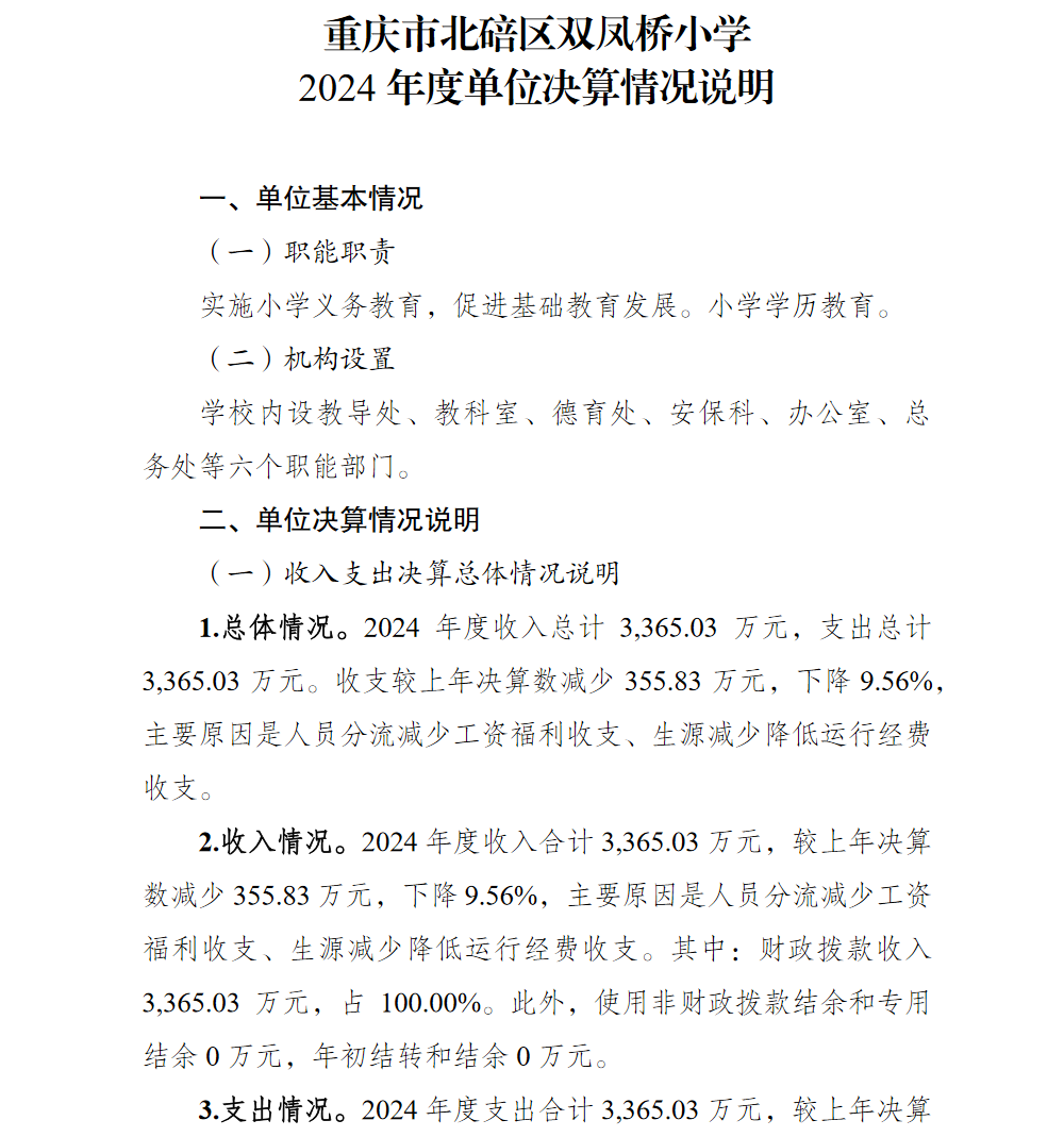 重庆市北碚区双凤桥小学2024年度单位决算情况说明