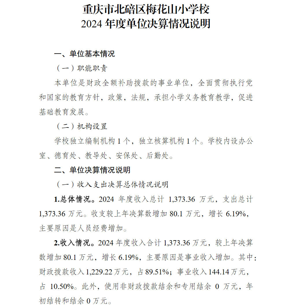 重庆市北碚区梅花山小学校2024年度单位决算情况说明