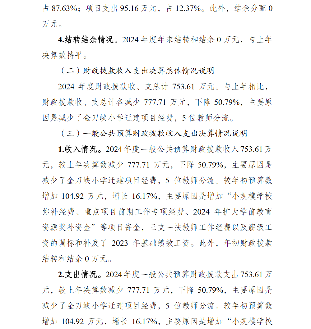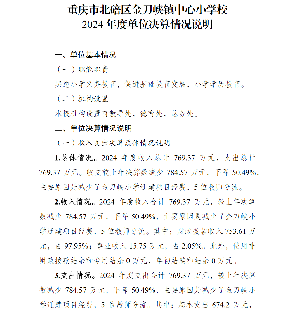重庆市北碚区金刀峡镇中心小学校2024年度单位决算情况说明