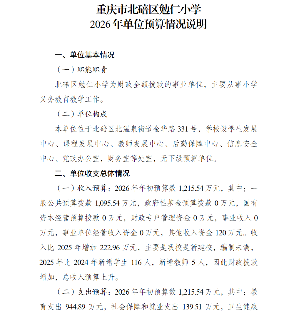 重庆市北碚区勉仁小学2026年单位预算情况说明
