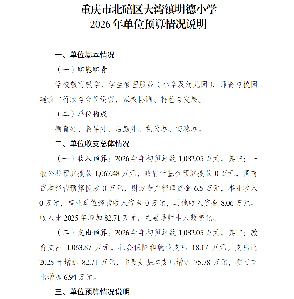 重庆市北碚区大湾镇明德小学2026年单位预算情况说明