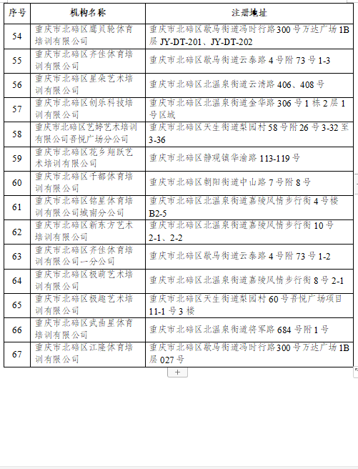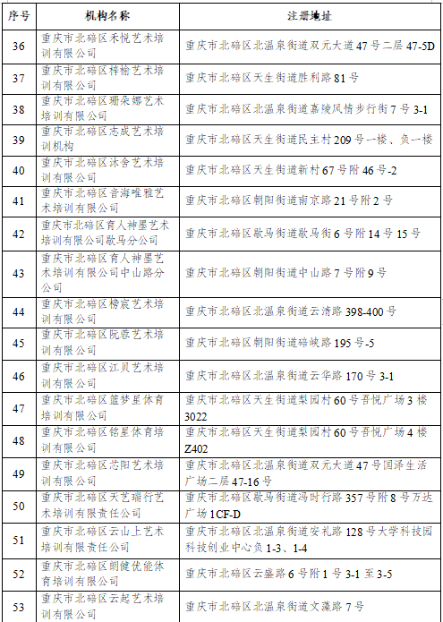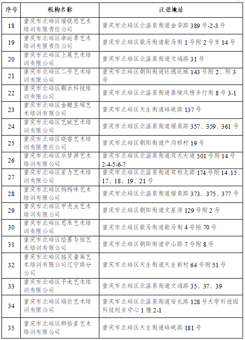 注销非学科类培训机构名单:重庆市北碚区飞达艺术培训机构、重庆市北碚区田甜艺术培训有限公司、重庆市北碚区贝贝熊艺术培训有限公司、重庆市北碚区乐亦吾思艺术培训有限公司、重庆市北碚区慧晨艺术培训有限责任公司、重庆市北碚区傲尘墨雅艺术培训有限公司