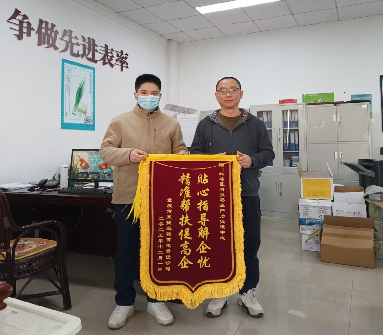 1月6日,区科技局生产力促进中心收到重庆市亚捷运输有限责任公司送来的一面锦旗,锦旗上写着“贴心指导解企忧,精准帮扶助高企”,表达了企业对我单位优质服务的高度认可与诚挚感谢。