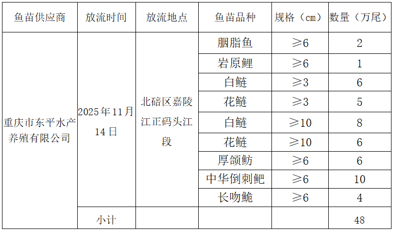 为恢复嘉陵江渔业资源,修复水域生态环境,北碚区农业农村委员会拟进行渔业资源增殖放流活动,现将增殖放流的时间、地点,鱼苗品种、数量、规格以及供应商进行公示,具体如下: