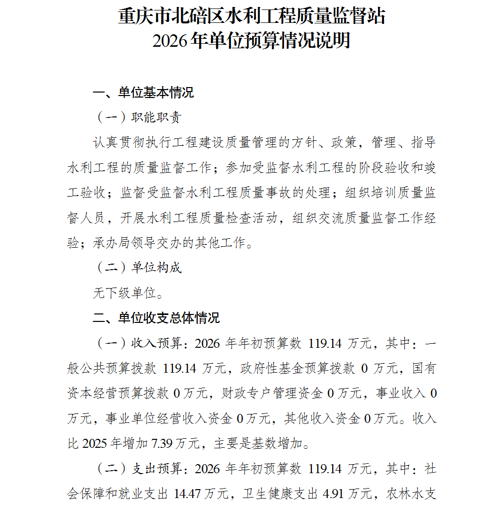 重庆市北碚区水利工程质量监督站2026年单位预算情况说明