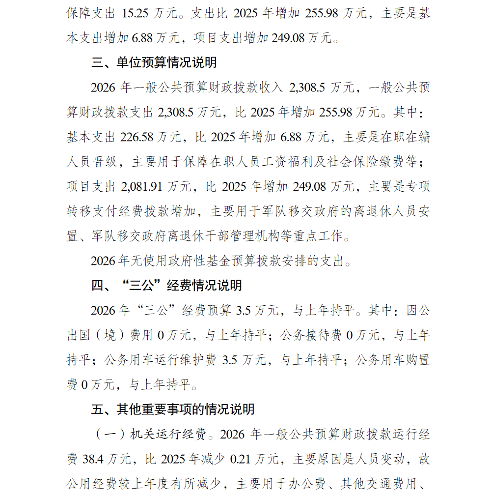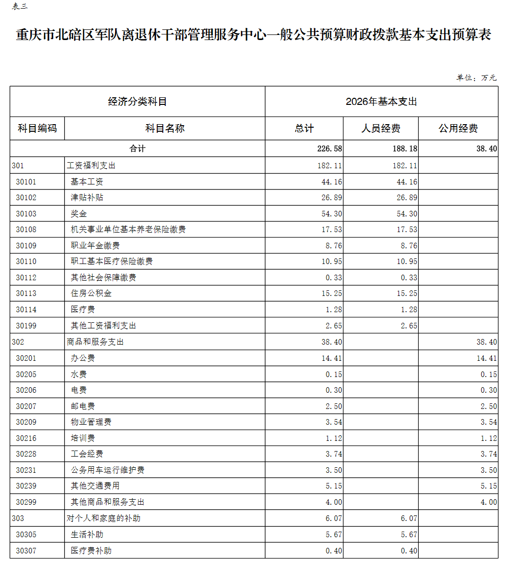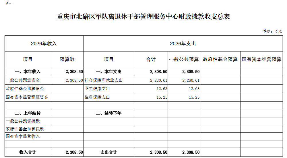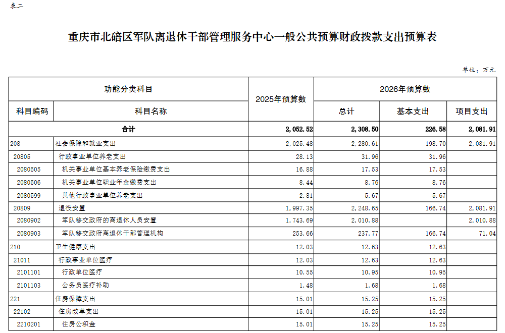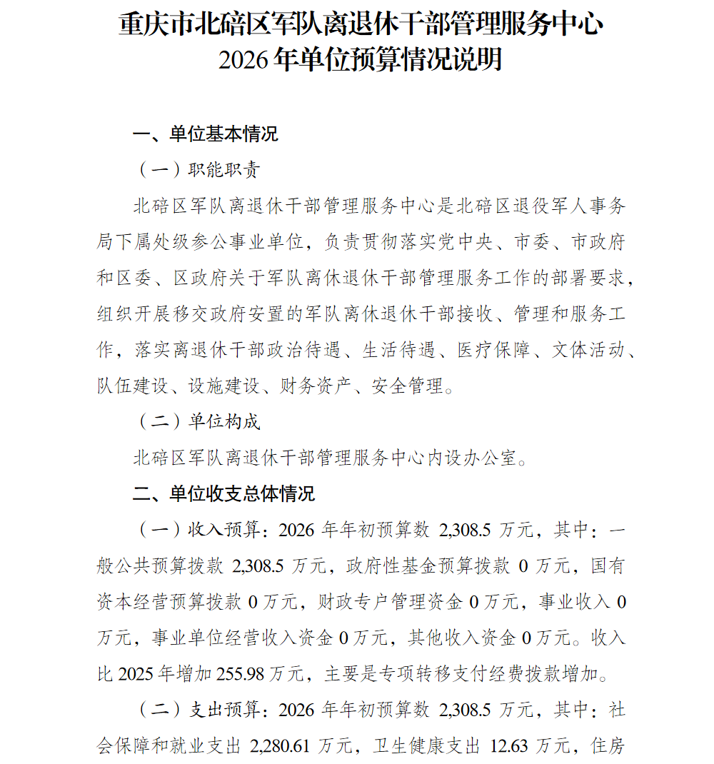重庆市北碚区军队离退休干部管理服务中心 2026年单位预算情况说明