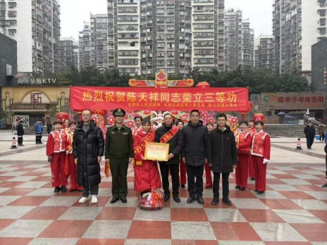 随后,喜报又传到歇马街道。在歇马广场阵阵欢庆锣鼓声中,送喜报队伍一行将荣立三等功的喜报,送至军人陈天祥同志的父母手上。其父母接过承载荣誉的喜报,激动之情溢于言表。仪式现场吸引了众多群众自发聚集围观,掌声与喝彩声不断,街坊邻里纷纷为陈天祥同志家的荣耀点赞,浓厚了“一人立功,全家光荣”的社会氛围。