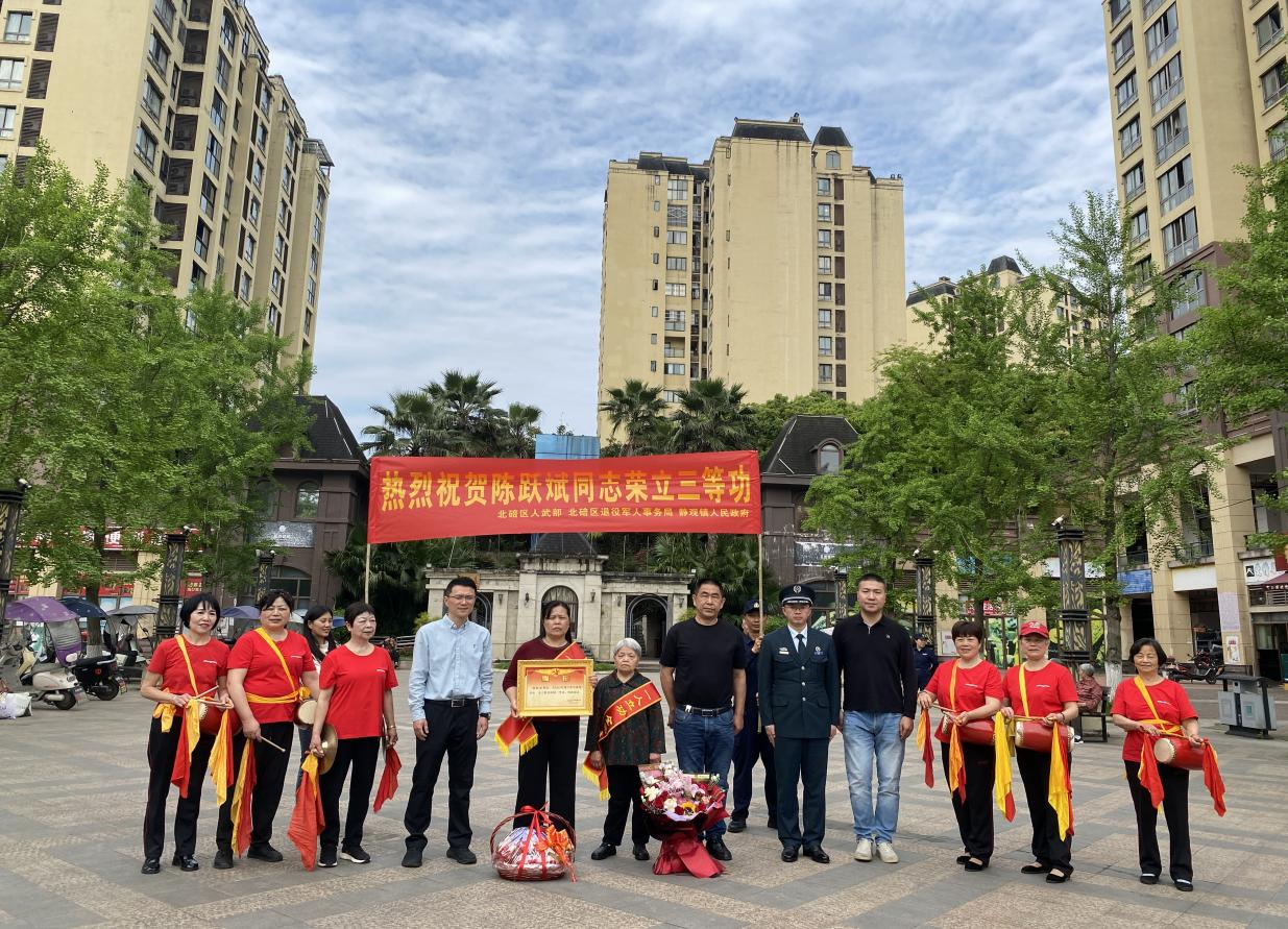 军功闪耀,家门荣光。为进一步弘扬拥军优属光荣传统,营造“一人参军、全家光荣,一人立功、全社会尊崇”的浓厚氛围,近日,北碚区退役军人事务局、北碚区人民武装部及静观镇、柳荫镇联合组成报喜团,敲锣打鼓,为近期在部队立功受奖的现役军人陈跃斌、王晨杰、杨宇航家属送上满载荣誉的喜报、慰问品和诚挚的祝福。