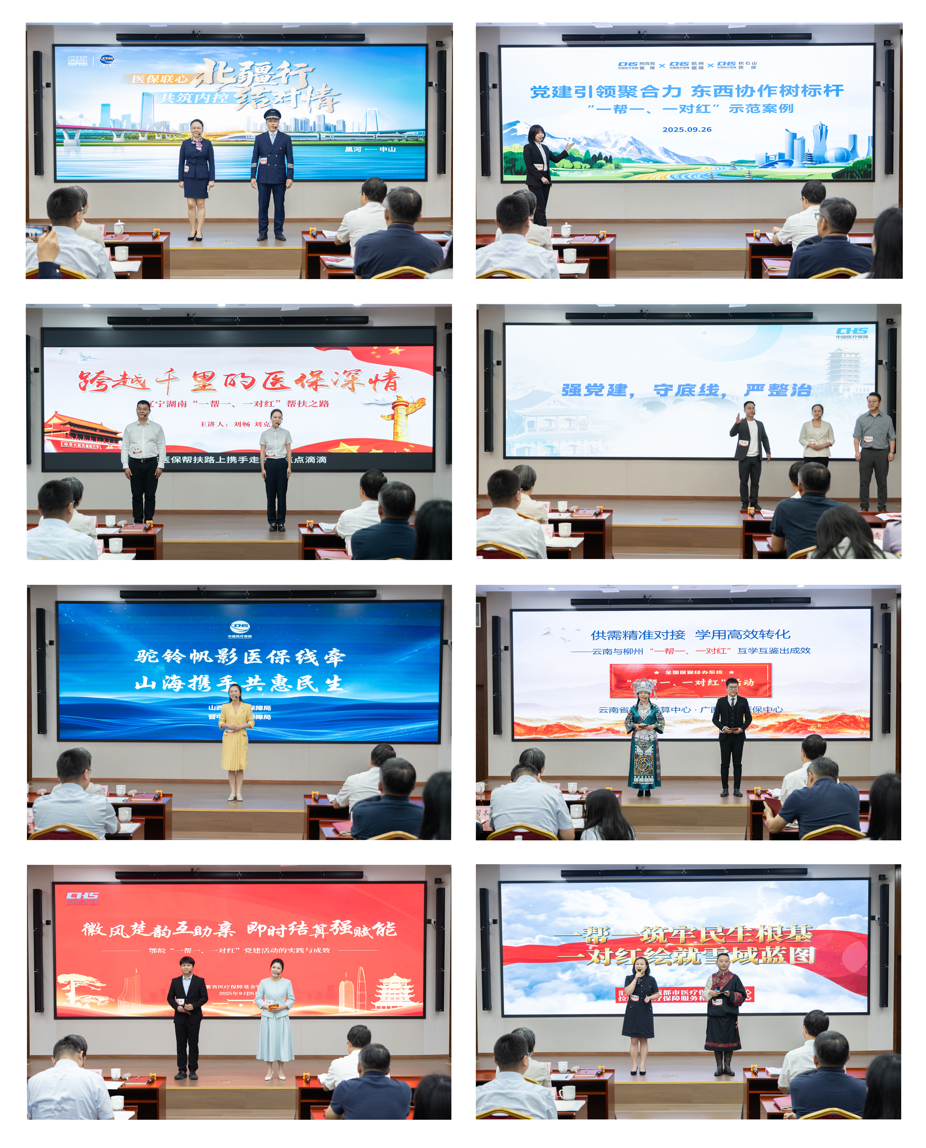 活动现场,8个结对组合通过视频展示、情景演示、数据可视化等方式,多维度呈现了“一帮一、一对红”活动成效——广东中山与黑龙江黑河创新推动医保经办内控管理体系建设;浙江杭州与甘肃积石山、新疆阿克苏以数智赋能经办能力提升;辽宁与湖南携手提升医保费用智能审核质效;河北与宁夏石嘴山、新疆生产建设兵团第二师多方协同优化智能审核模式;安徽宣城与山西晋中聚焦医保经办服务体系优化;云南与广西柳州协同推进异地就医支付方式改革;安徽与湖北深化即时结算改革;四川成都与西藏拉萨携手提升医保协议管理精细化水平,集中展现了全国医保经办系统深入贯彻习近平总书记重要指示精神,坚持党建和业务互融互促,推动经办工作提质增效的生动实践。